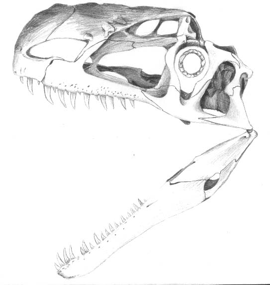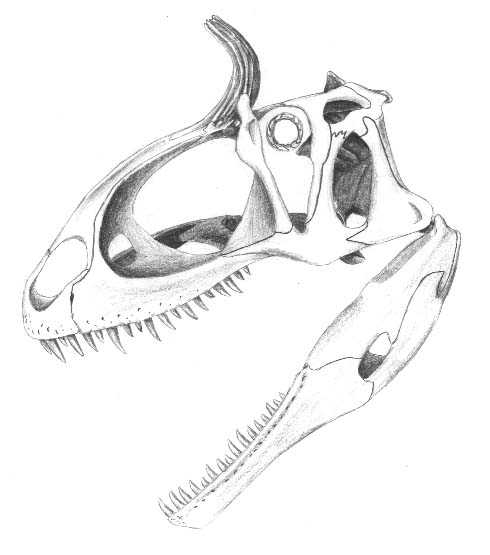 Now, here's some sketches I made of the skulls of *Cryolophosaurus* and *Monolophosaurus*, if anyone's interested. There's a hefty amount of bytes here for a simple message, though, 59k for both pics, so be wary! :-) The Cryo skull is restored as I believe it was longer than the original illustration, and I've drawn such characters as the teeth and maxillary fenestra as based on Mono and other primitive carnosaurs like *Piatnitzkysaurus*. The original figure, being a line sketch, also ommits the surface features of the bones, so I've taken some liberties here, but are based on the crested nasals. I've also added sclerotic rings to both as based on the morphology of the orbit and how it would hold such a ring. Scale is not given, as I don't know the lengths. Mike? If you get these, could you post these to your site? Comments are welcome, Jaime A. Headden ______________________________________________________ Get Your Private, Free Email at http://www.hotmail.com