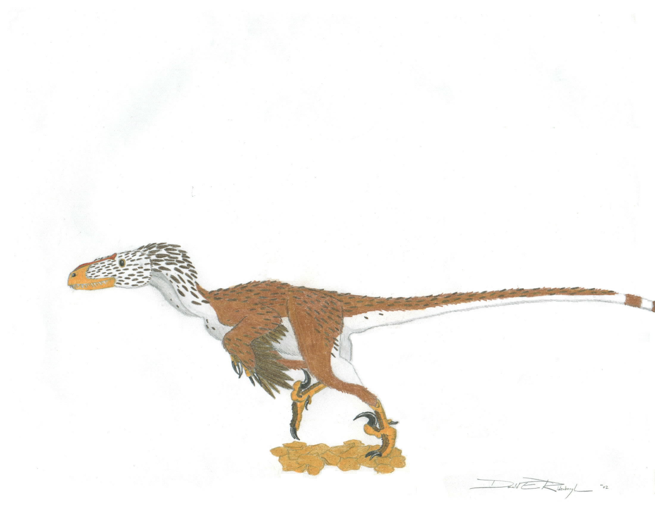 My name is Donald Ridenbaugh, and though I don't say much on the list, I do read alot, and know how many good paleontologists and paleo-artists there are here. I was wondering if any of you would critique a Deinonychus I just finished drawing (Don't worry, it's feathered, not the scalie monstosities from the JP movies, I know better than that). It's down under attachments. Thanks.